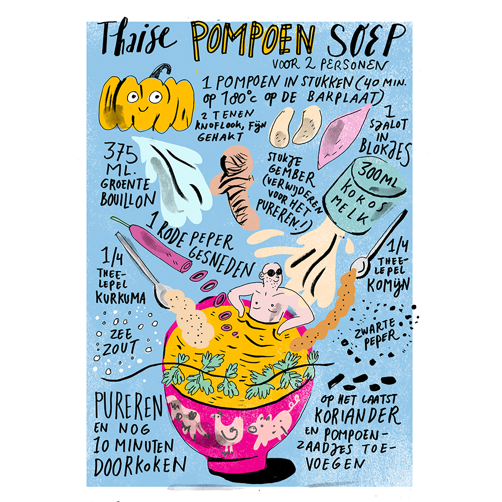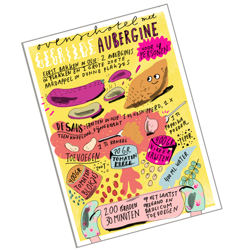 For Wakker Dier Nederland I designed three postcards, with delicious vegetarian recipes. I also drew some chickens.