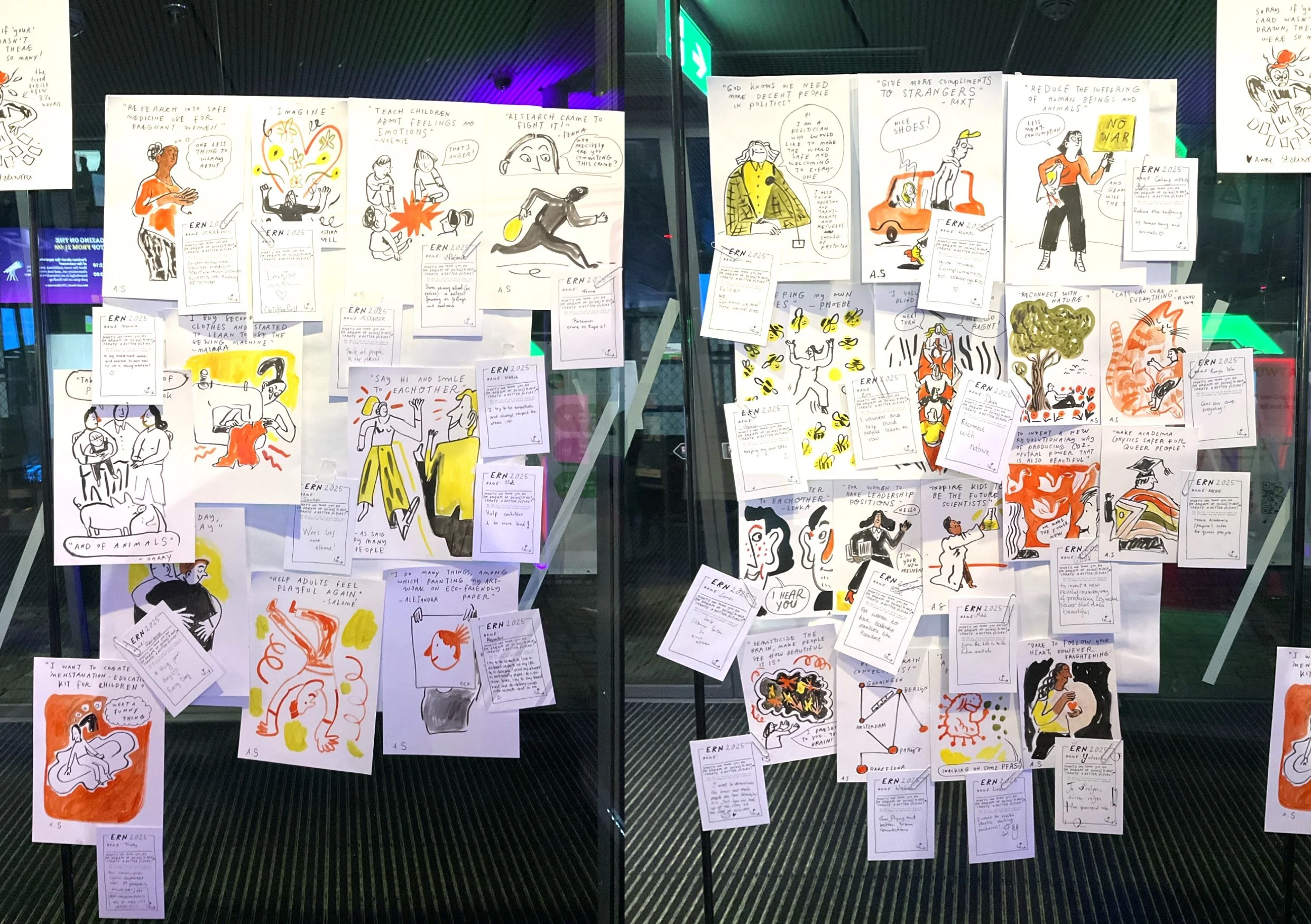 Doel was data verzamelen over hoe men zich voelen over de toekomst. Dat deden we door kaartjes uit te delen met de vraag “wat doe je (of zou je willen doen) om bij te dragen aan een betere toekomst?”. Ik illustreerde de antwoorden live aan een tafel met inkt en verf, en vulde gedurende de avond een muur met tekeningen.