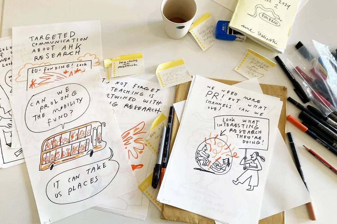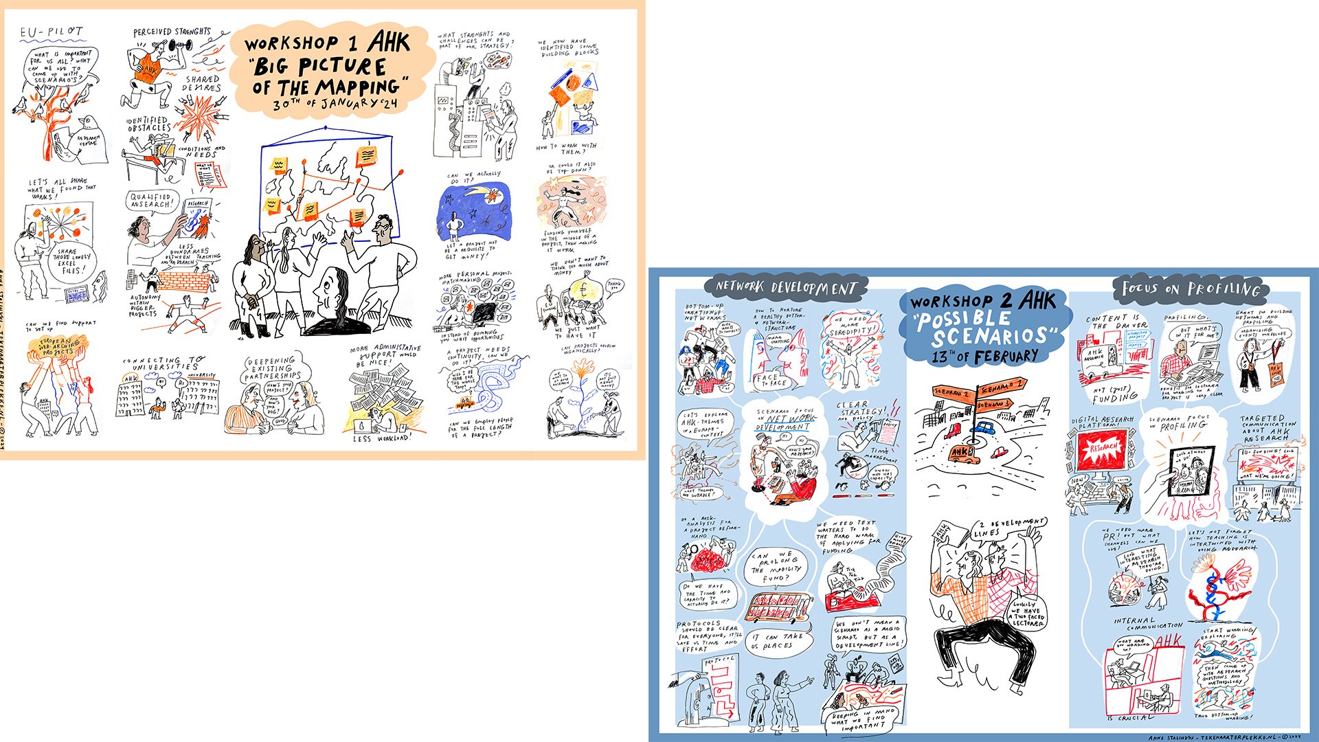Tijdens twee workshops kwamen lectoren van verschillende kunst-opleidingen samen, om te praten over internationalisering en samenwerking. Ik tekende mee en voegde de tekeningen na afloop samen tot een grote overzichts-poster.
