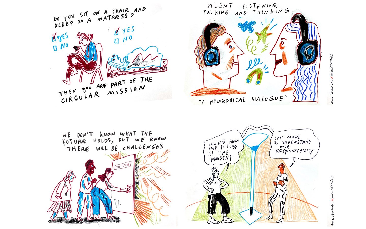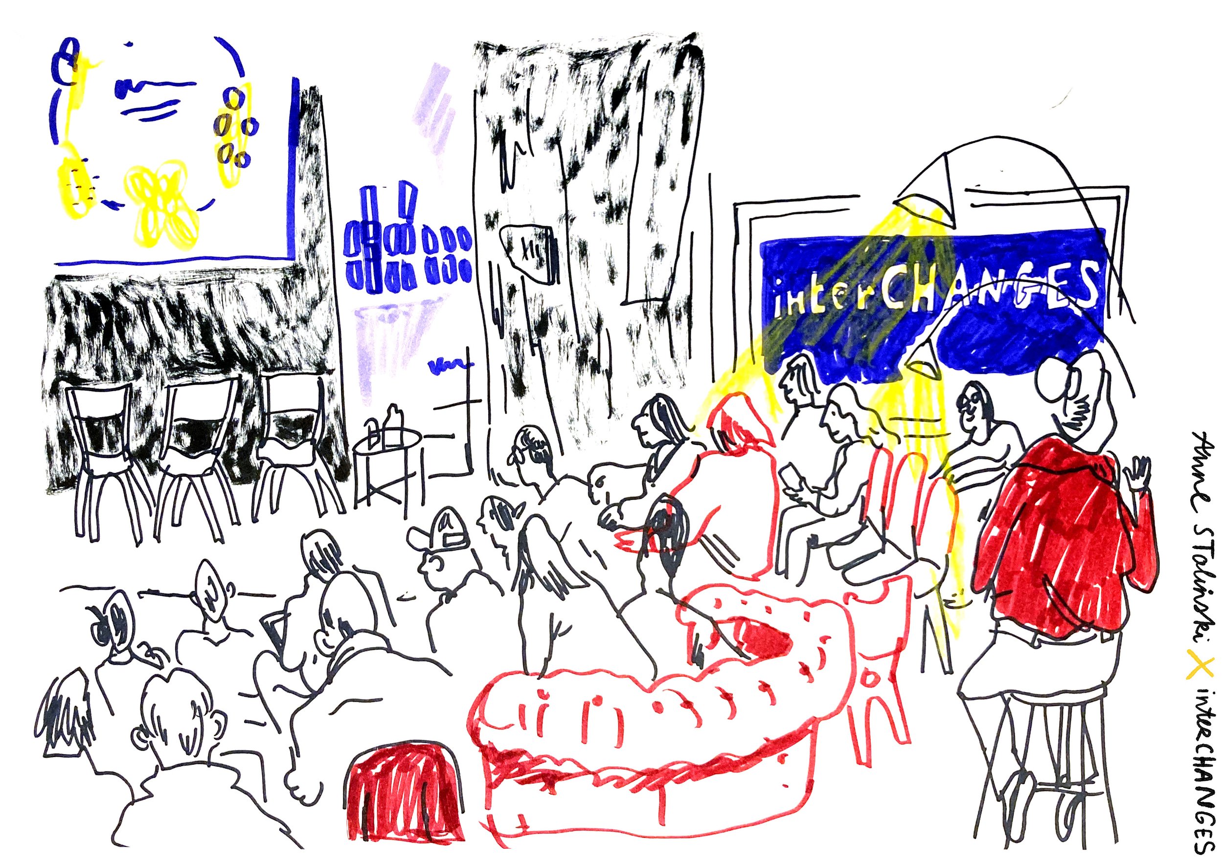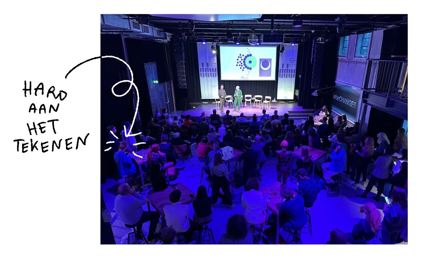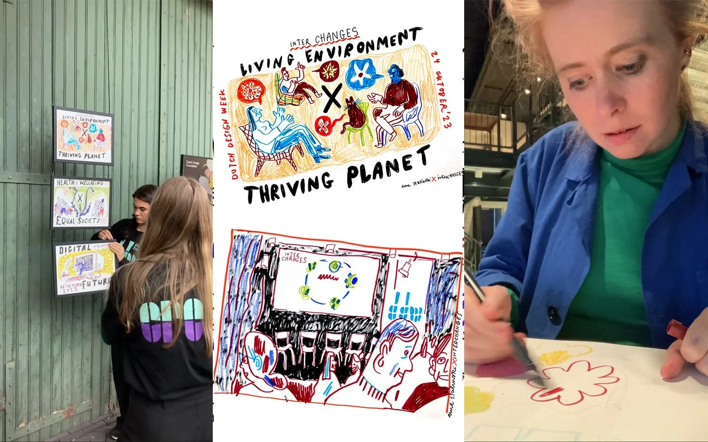 Interchanges is een platform waar slimme designkeuzes voor de toekomst worden besproken. Tijdens de Dutch Design Week 2023 tekende ik bij 3 sessies. Elke dag kozen we de beste tekening uit om op te hangen, de rest werd gebundeld in een boekje.